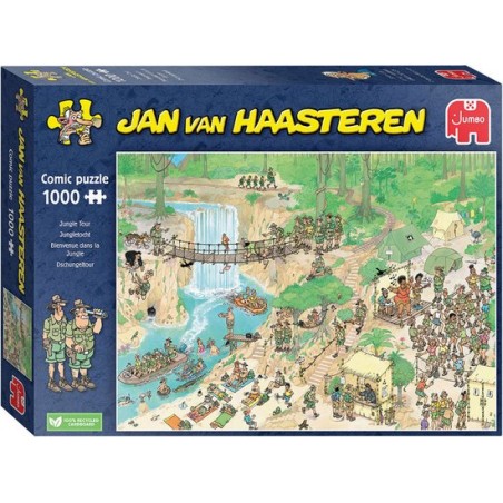 De paden op, de lanen in. De Jan van Haasteren familie bezoekt de mooie natuur van de jungle. Samen met de andere bezoekers genieten ze volop, hoewel iemand wat moeite heeft met de brug.