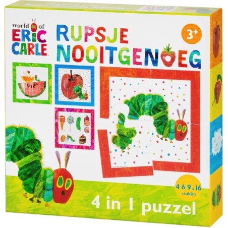 Deze set bestaat uit 4 puzzels met bontgekleurde afbeeldingen uit het boek Rupsje Nooitgenoeg van Eric Carle. Hierin gaat het rupsje op zoek naar heerlijke hapjes die je ook terug ziet op de puzzels. De jongste puzzelaars beginnen met een puzzel van 4 stukken en wie toe is aan de volgende uitdaging kan een puzzel van 6, 9 of 16 stukken leggen.