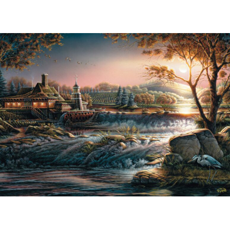 Schmidt legpuzzel van 1000 stukjes van artiest Terry Redlin met op de puzzel een prachtig huis in een open landschap waar de zon onder gaat en de nacht invalt.