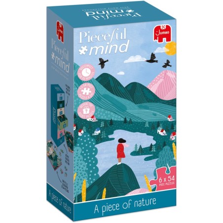 Inhoud: 6 puzzels van 54 stukjes, mindfulness-oefening en een kleurplaat aan de achterkant van de puzzel.
