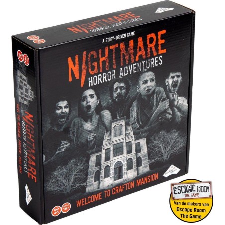Nightmare Horror Adventures is een spannende, meeslepende en avondvullende belevenis vol verrassingen. In ‘Welcome to Crafton Mansion’ speel je één van de vijf Crafton-kinderen en ga je in het oude landhuis op zoek naar aanwijzingen over de moord op jullie ouders 15 jaar geleden. Onderzoek de kamers, herontdek je verdrongen herinneringen en kom stap voor stap dichter bij de waarheid. Overleg en maak de juiste keuzes. Maar let op: de tijd dringt en niets is wat het lijkt! In dit coöperatieve, verhaal-gedreven spel heb je maar één kans om de echte moordenaar te vinden en het mysterie op te lossen...