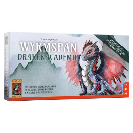 Om nog meer te leren over draken open je een drakenacademie! In deze uitbreiding op Wyrmspan ontmoet je een grote hoeveelheid nieuwe draken en grotten, doeltegels, drakengilden en een nieuw rondenspoortableau om jouw interactie met deze geweldige beesten nog magischer te maken! Let wel goed op, want de nieuwe tienerdraken kunnen wat onstuimig zijn..!